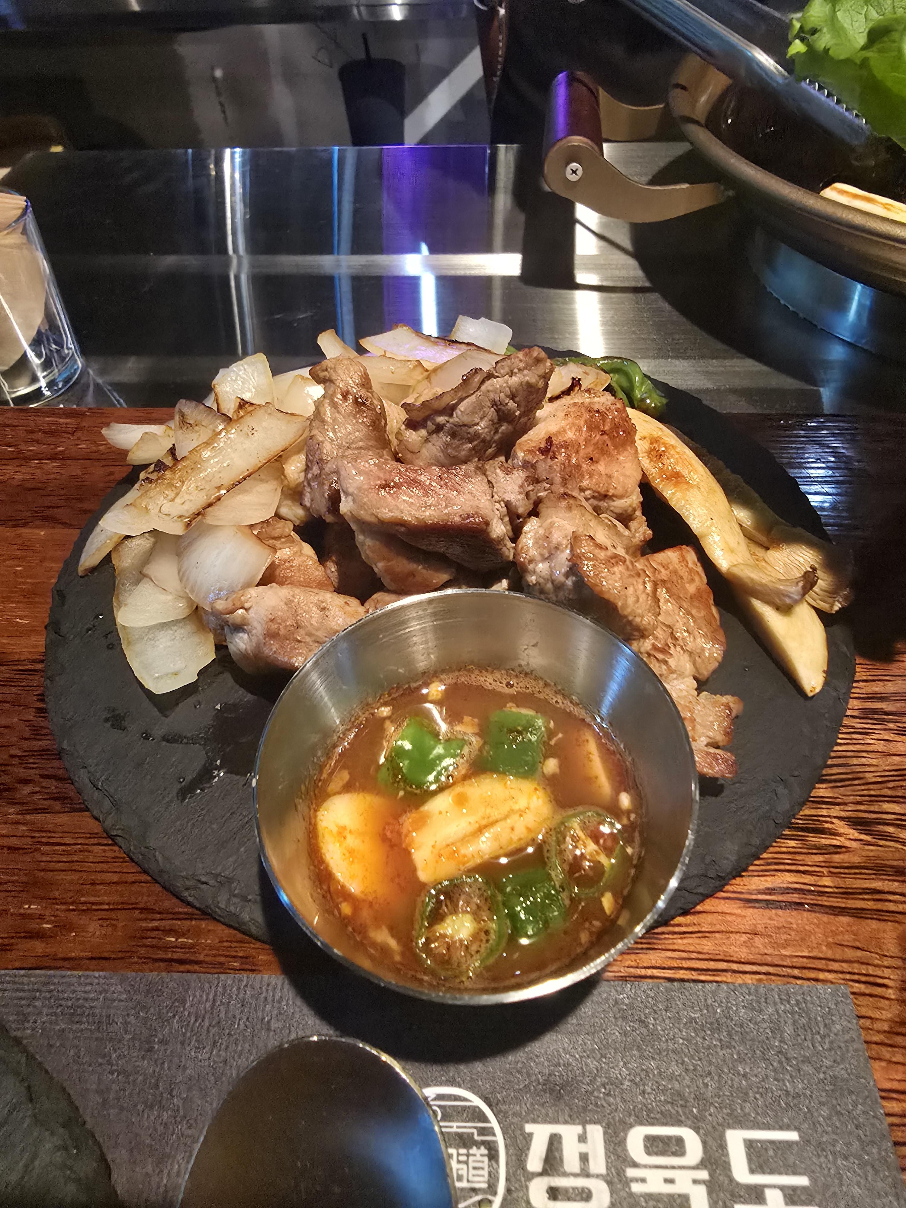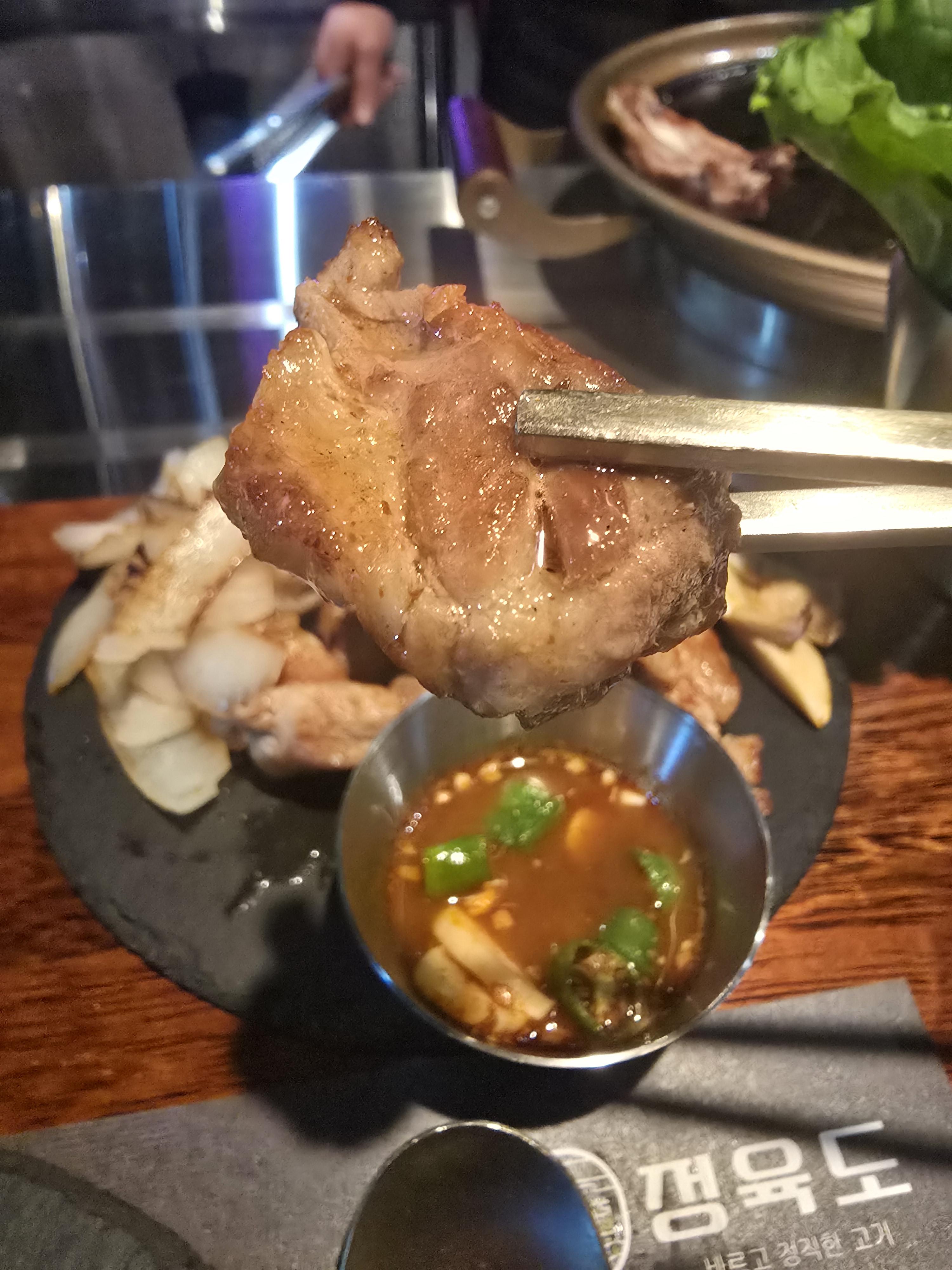 대표님의 추천대로 소금만 찍어서 먼저 한입 먹어보았는데 음... 아주 적당히 잘 구워진 고기의 참맛을 느낄 수 있었어요