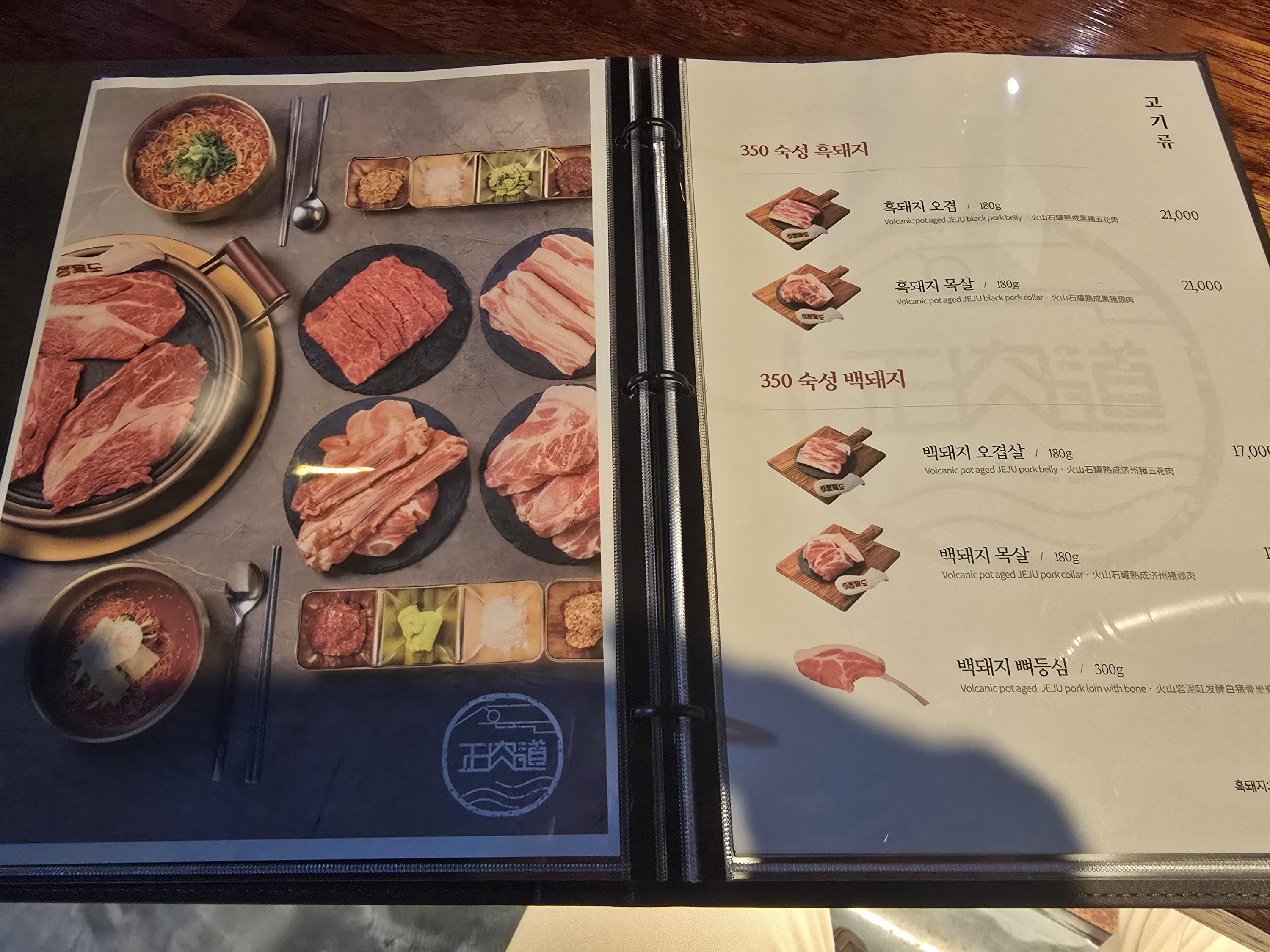 자리에 앉으니 메뉴판을 주셨는데 메뉴판이 두껍더라고요 뭔가 다양한 메뉴가 있겠다는 기대감을 가지고 메뉴판을 펼쳤네요 다양한 메뉴들이 있었지만 오늘 저의 선택은 돼지 생갈비였어요😁