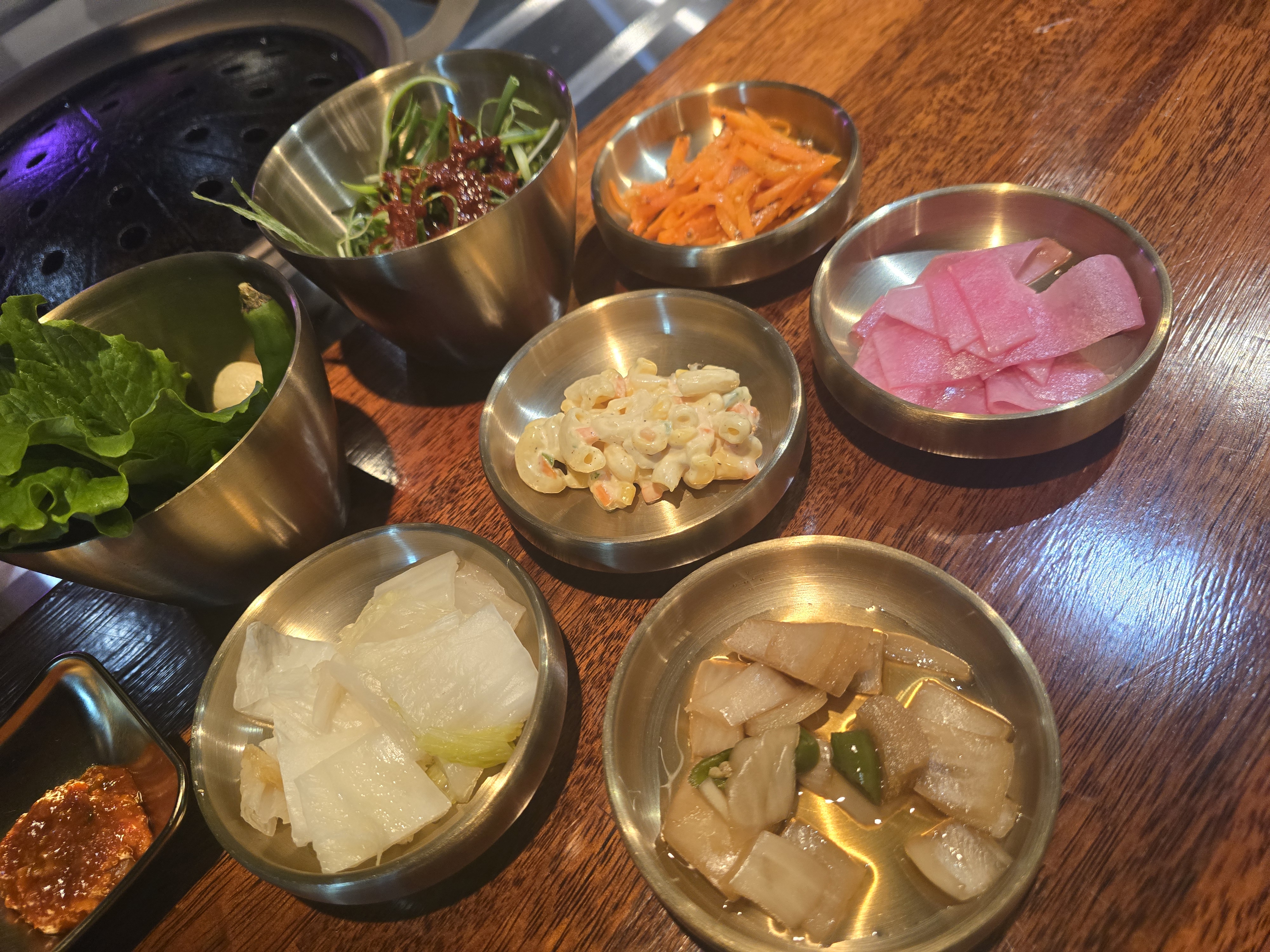 먼저 기본반찬이 세팅이 되는 데 다른 고깃집들과는 조금 다른 구성이더라고요 마카로니와 당근채볶음 같은 건 처음 보았어요 😄