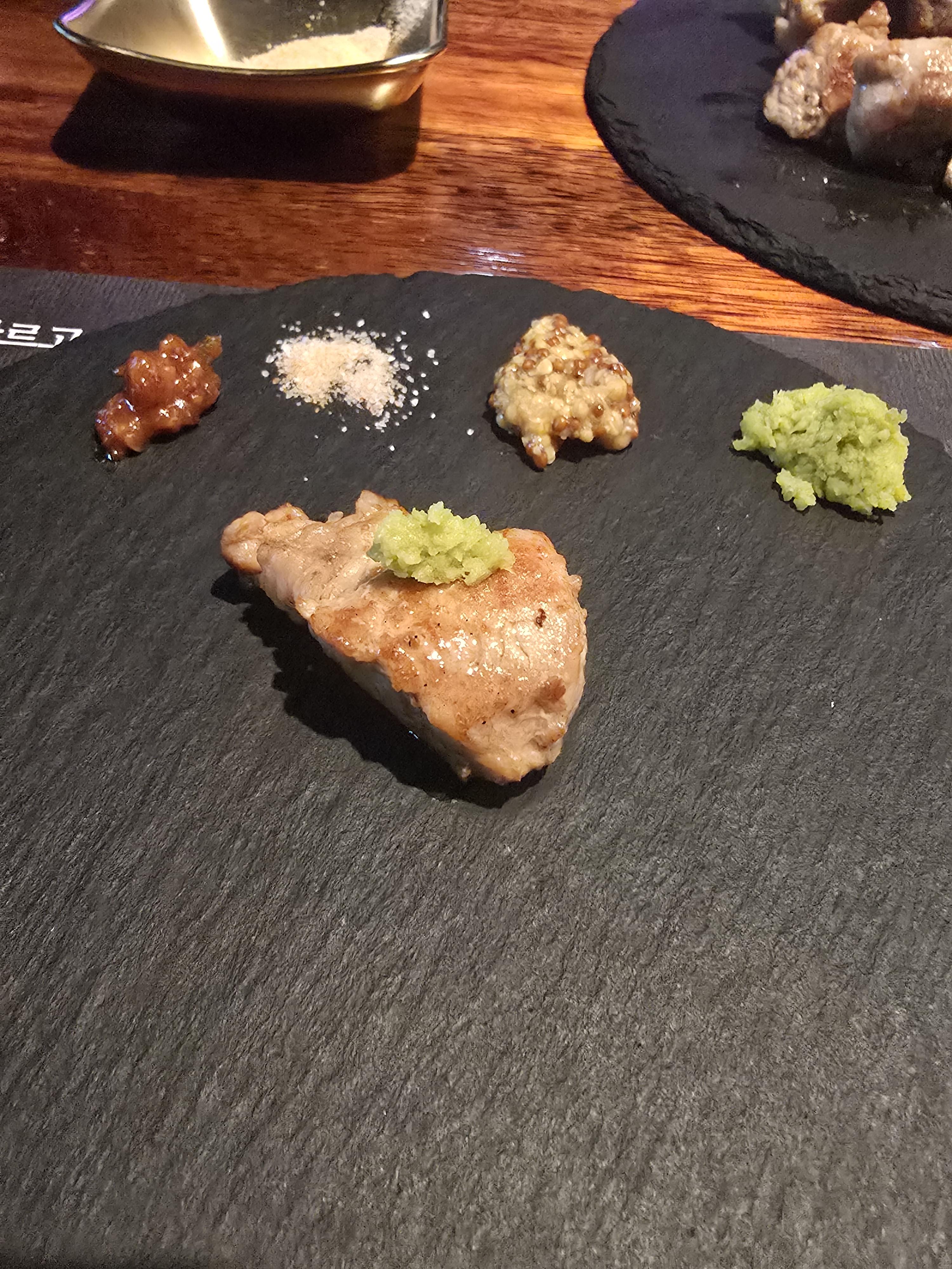 고기를 찍어먹을 소스도 4가지나 나오는 데 소금, 홀그레인, 고추냉이, 쌈장을 차례대로 놓으니 이것도 멋지더라고요