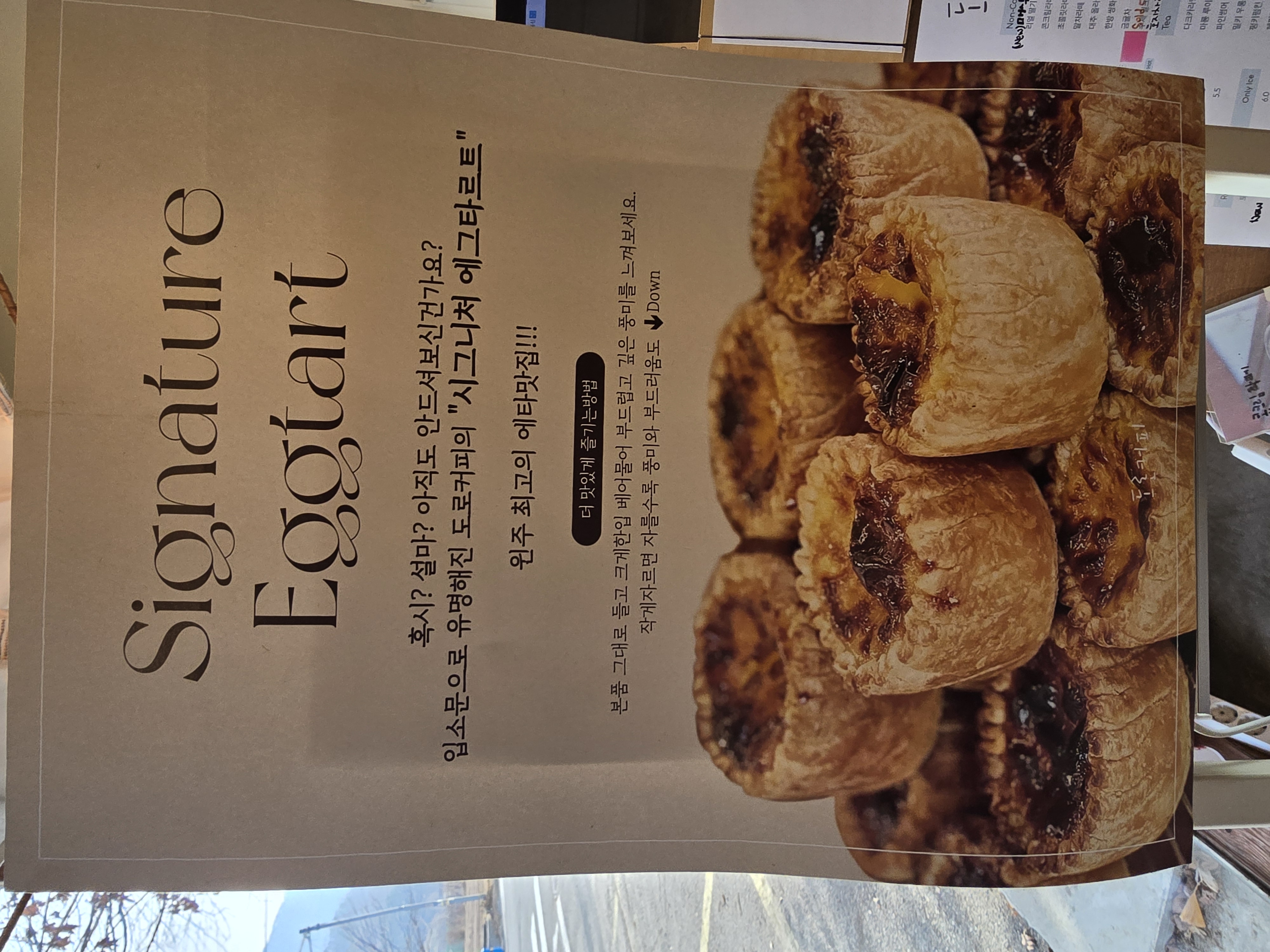 시그니처인 에그타르트는 포스터도 따로 있었는데 점심을 바로 먹은 직후라 배가 불렀음에도 시그니처 메뉴를 그냥 지나칠 수 없었는데 그냥 지나쳤더라면 엄청 후회할 뻔 했어요