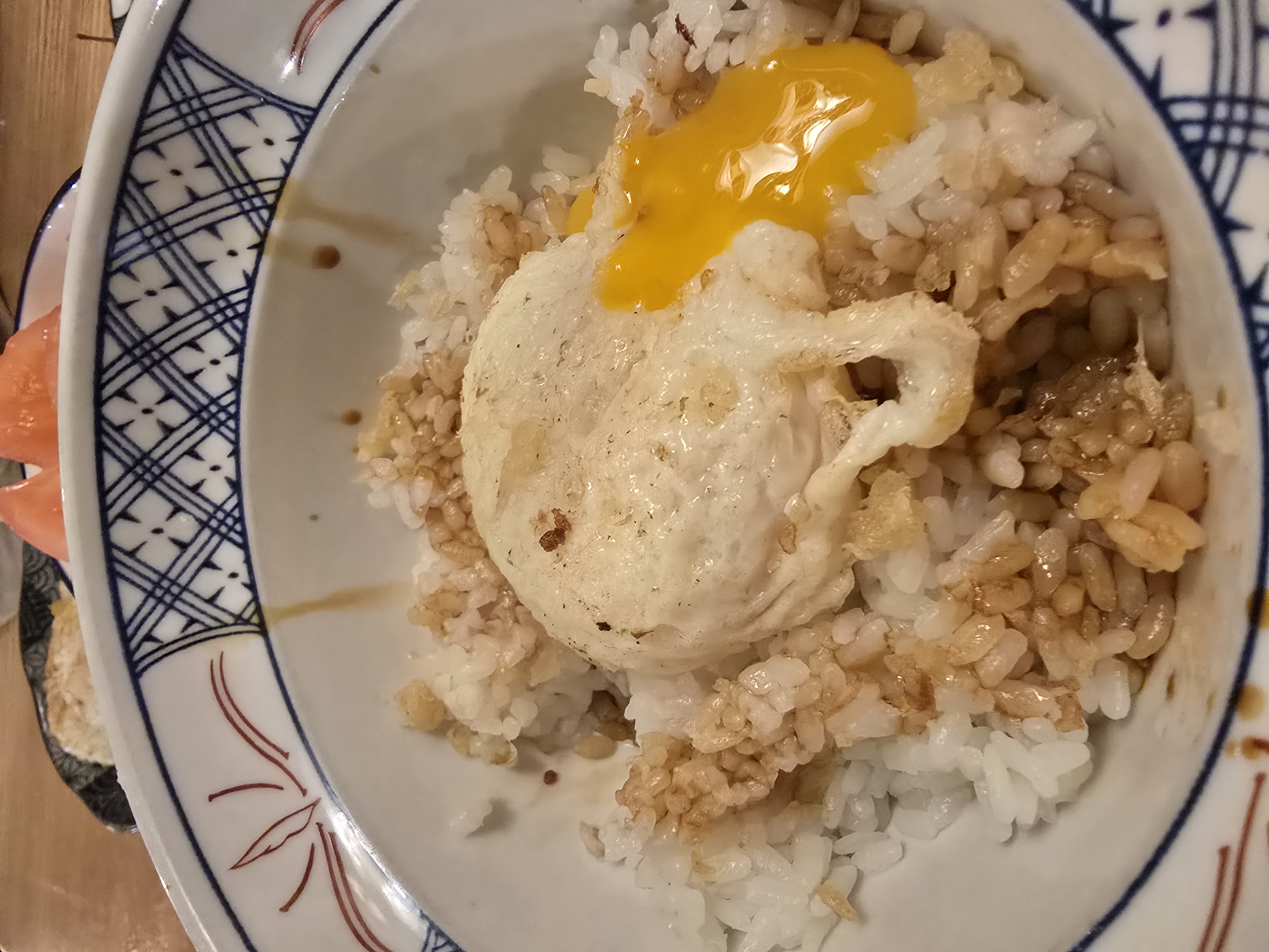 튀김을 덜어내고 나니 밥과 온천계란이 보이더라고요 온천계란 노른자 잘 깨서 밥과 함께 잘 비벼서 먹으면 되는 시스템이더라고요