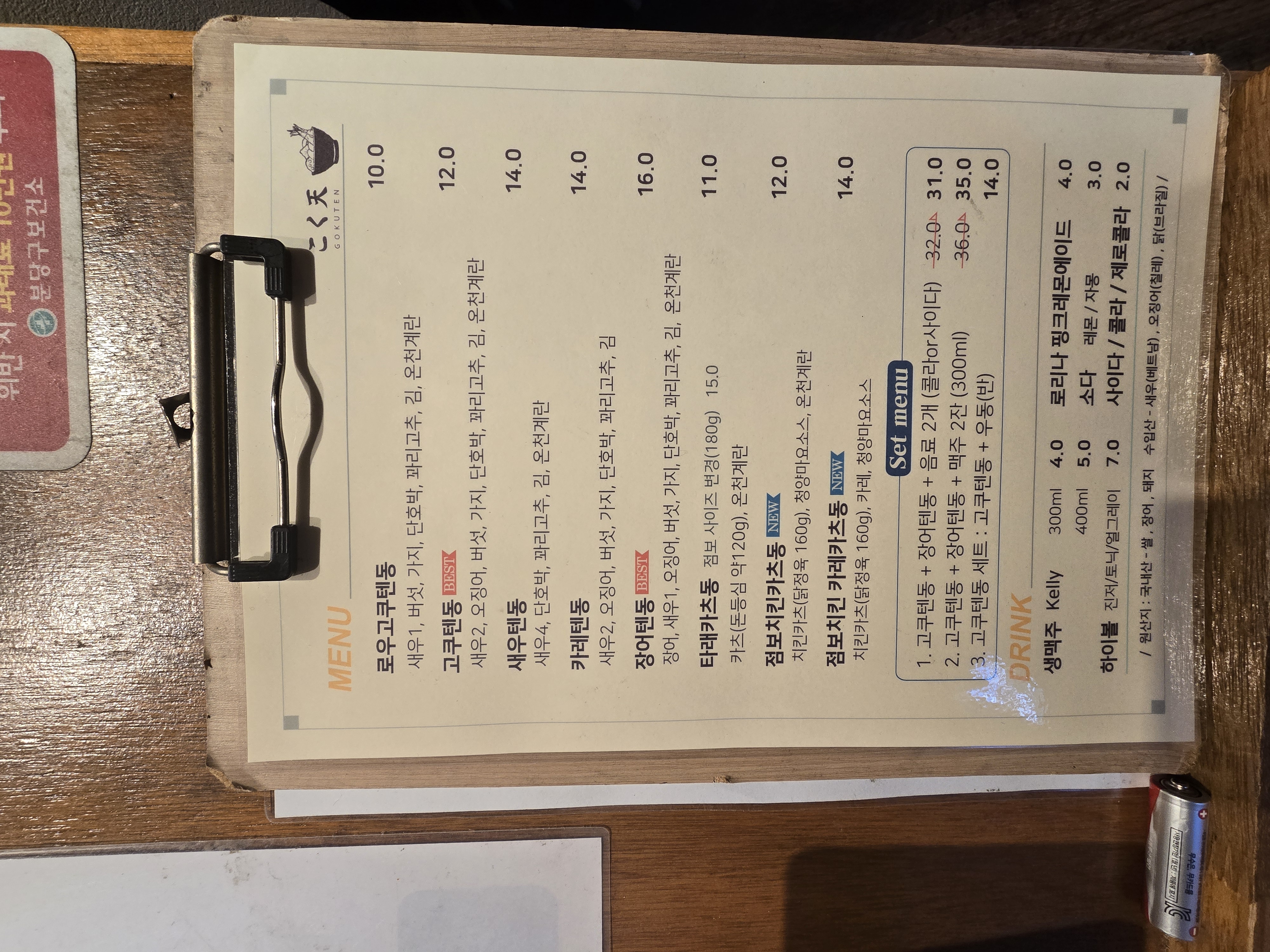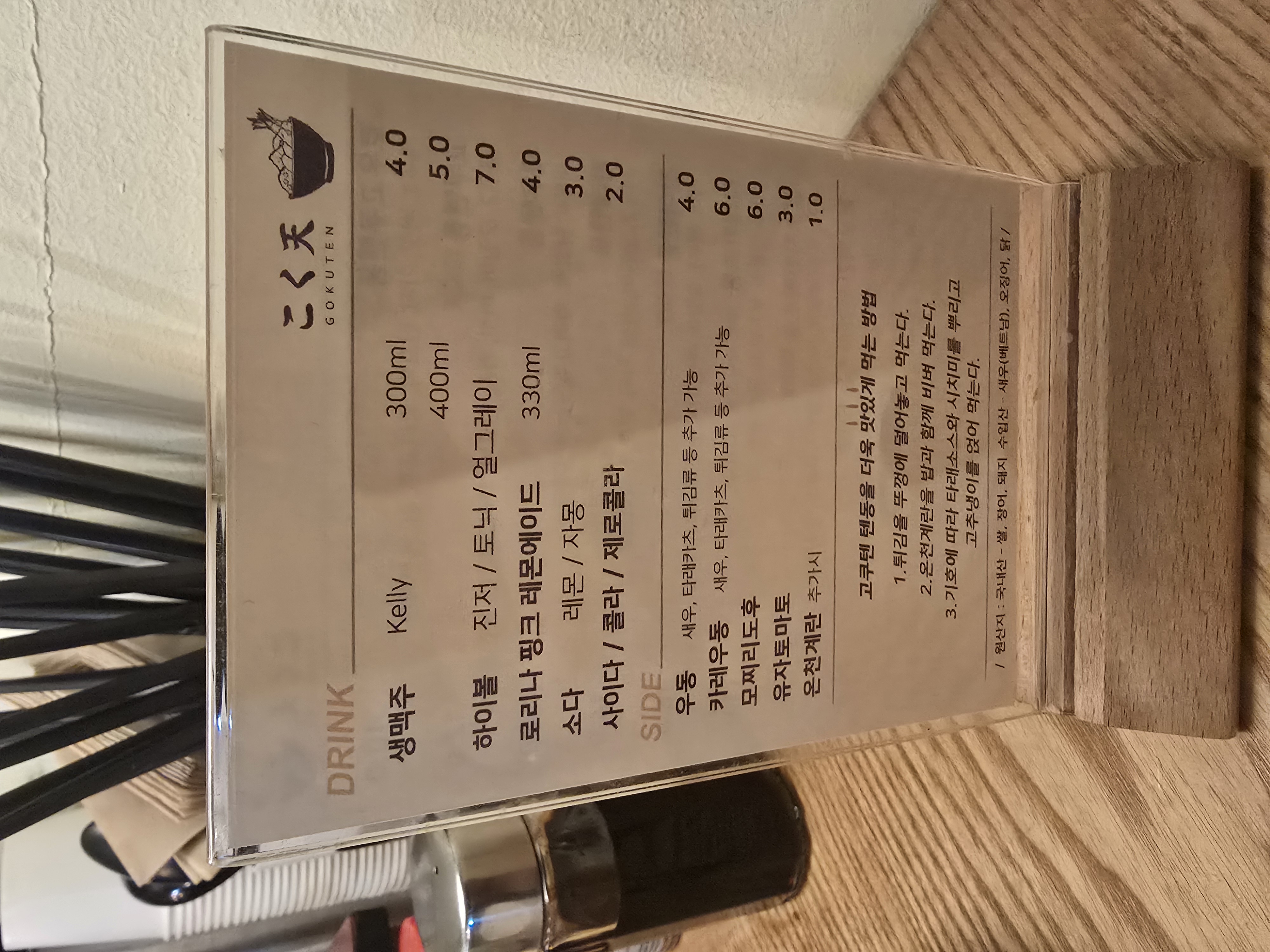 메뉴판이에요 고쿠텐동과 장어텐동 새우텐동 등 다양한 텐동이 있고요 세트메뉴도 있는데 세트메뉴는 음료와 함께 제공되고 할인이 있어요 저희는 세트메뉴를 주문했는 데 고쿠텐동과 장어텐동 그리고 음료 2잔이 포함된 세트였어요