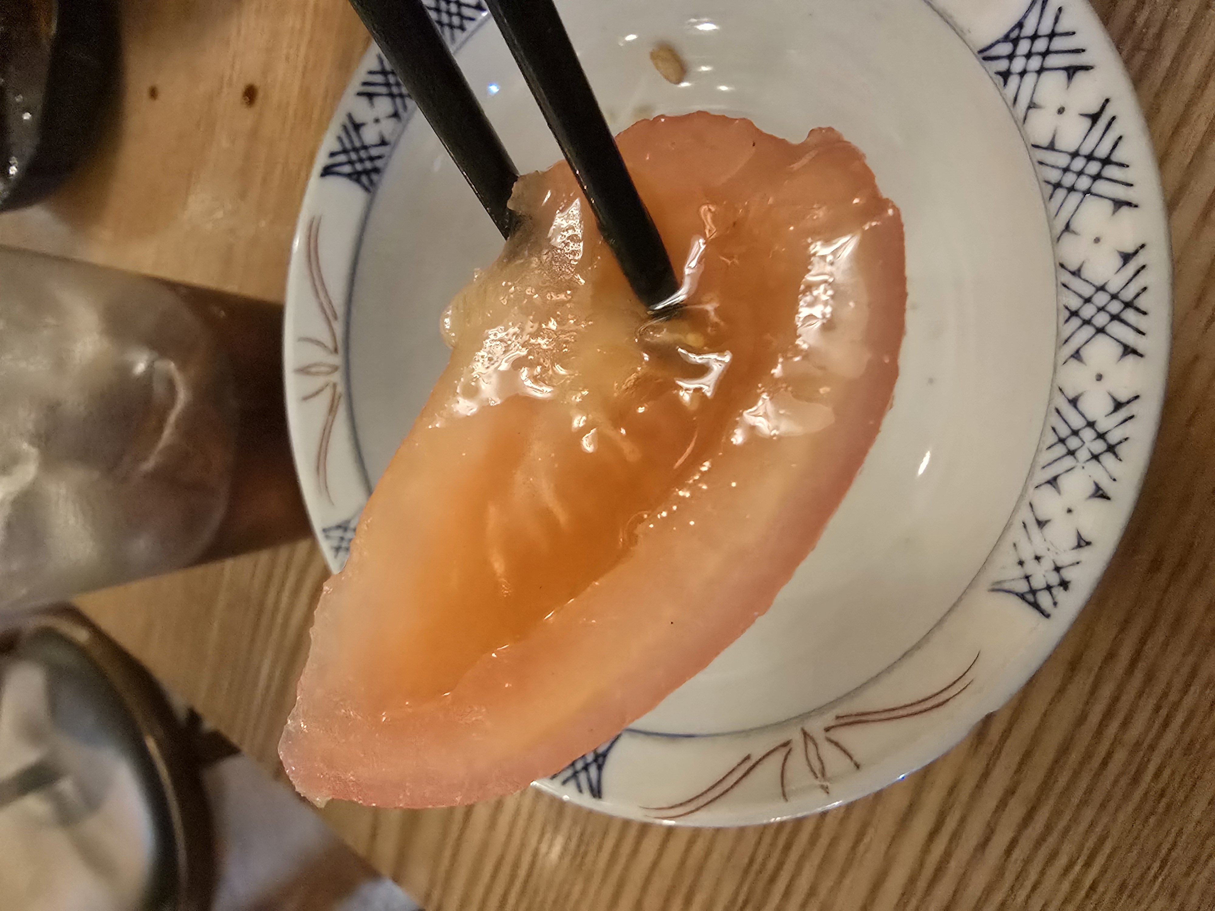 다양한 종류의 튀김을 맛있게 다 먹고 나니 입이 조금 느끼하다고 생각될 때 후식메뉴인 유자토마토가 보이길래 냉큼 시켜보았어요