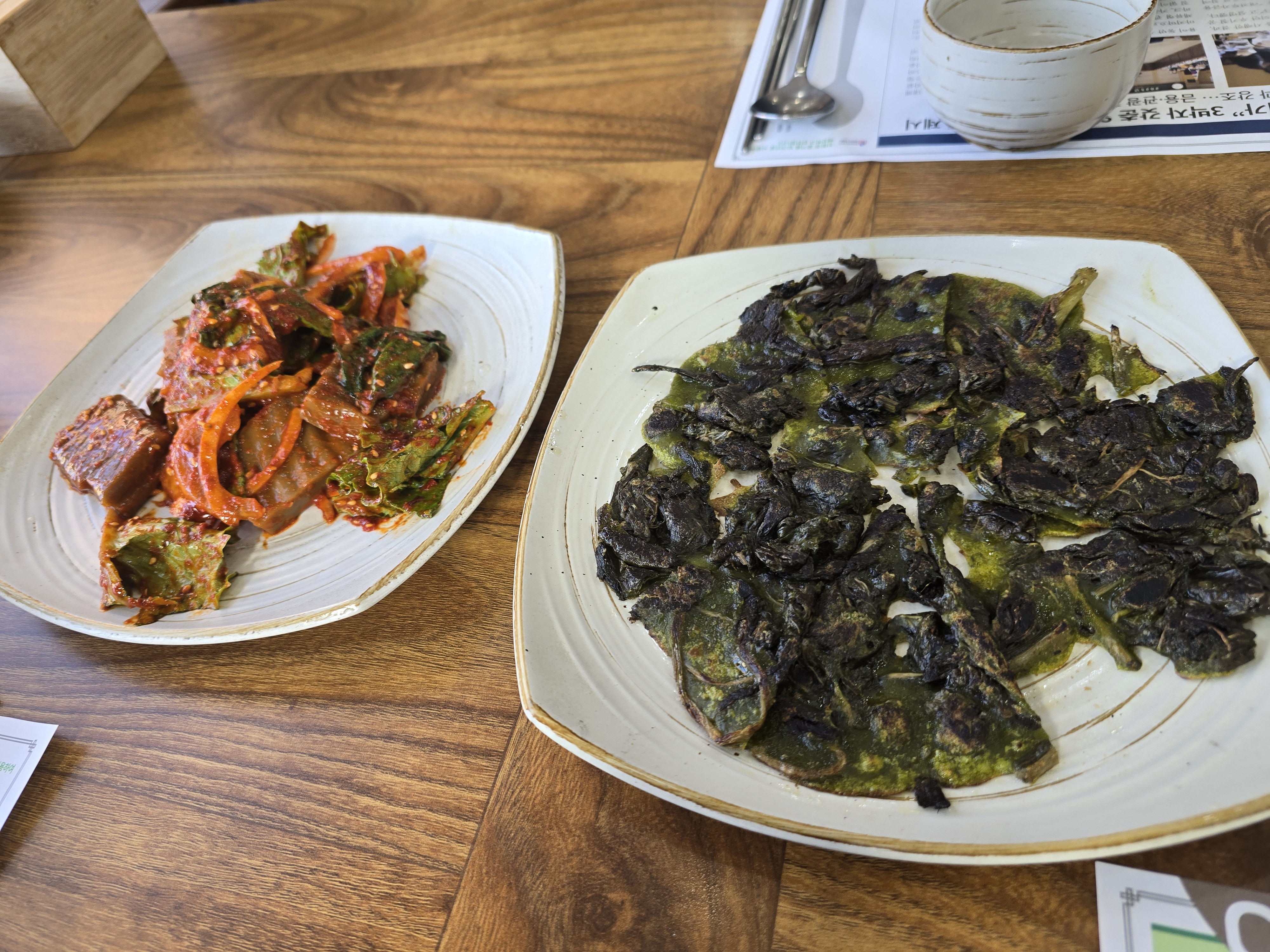 처음으로 나온 메뉴는 곤드레 전과 잡채였어요. 처음 보는 곤드레 자체는 특이한데 매우 감칠맛이 나 보였어요