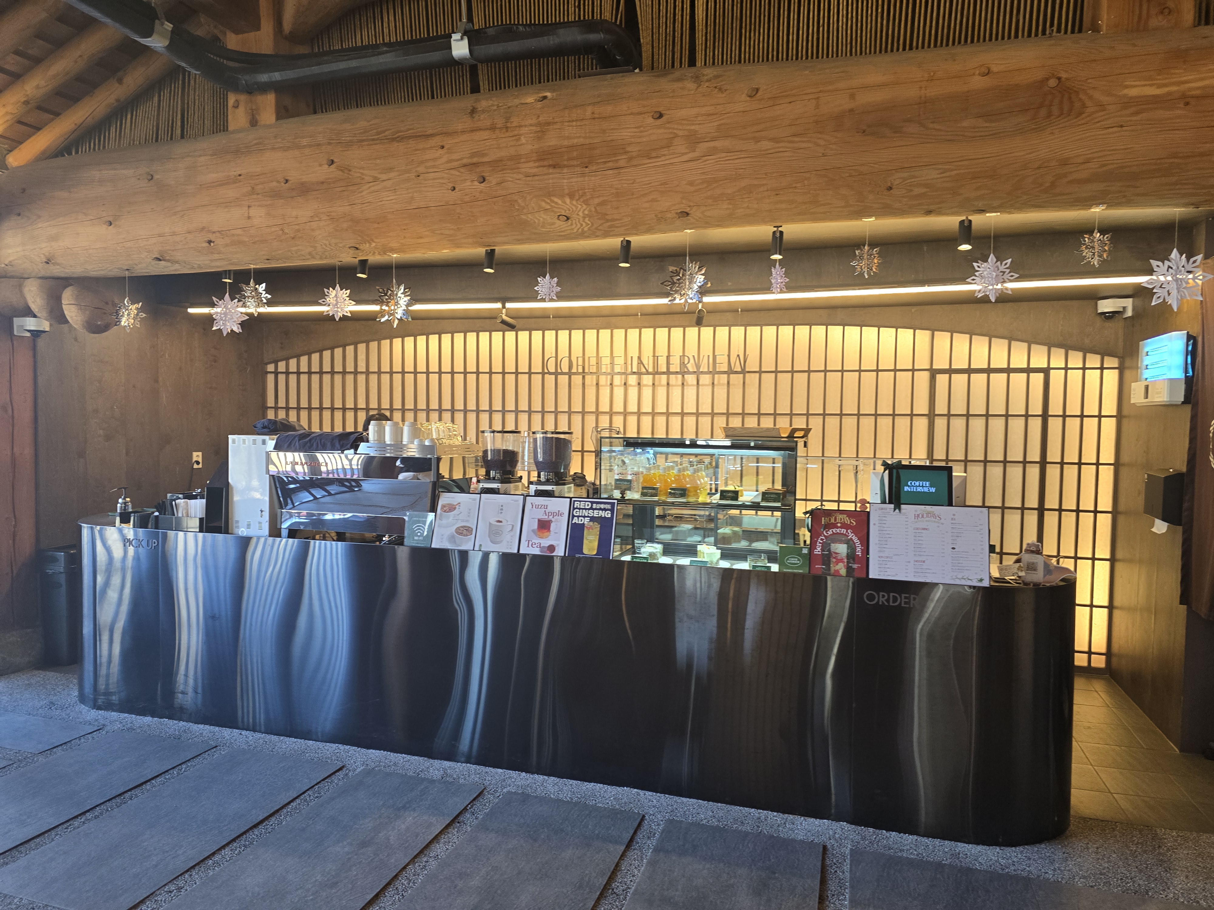 주문대에서 바라본 매장 전경이에요 한옥 천장과 돌들을 사용한 인테리어가 진짜 독특했어요