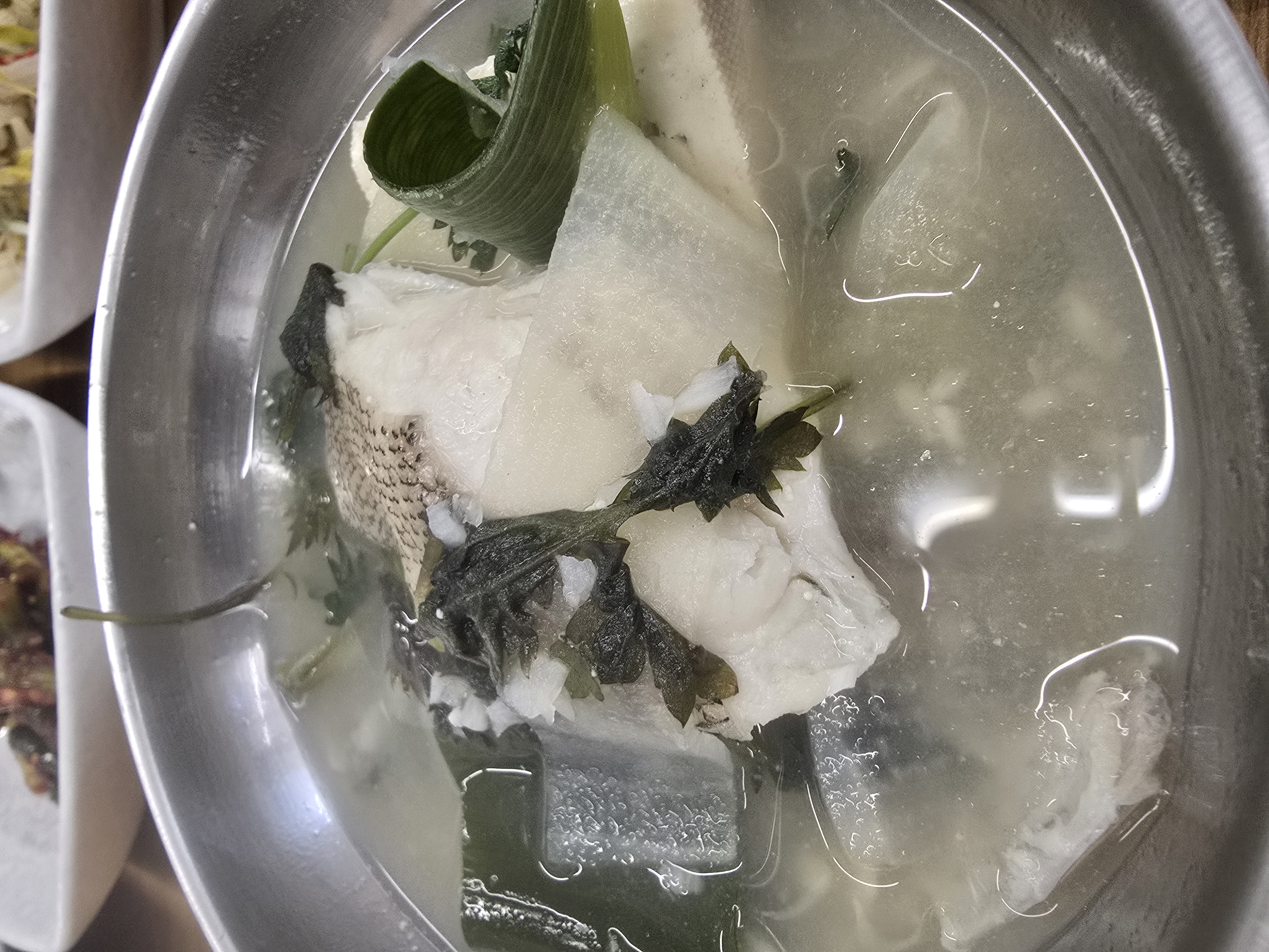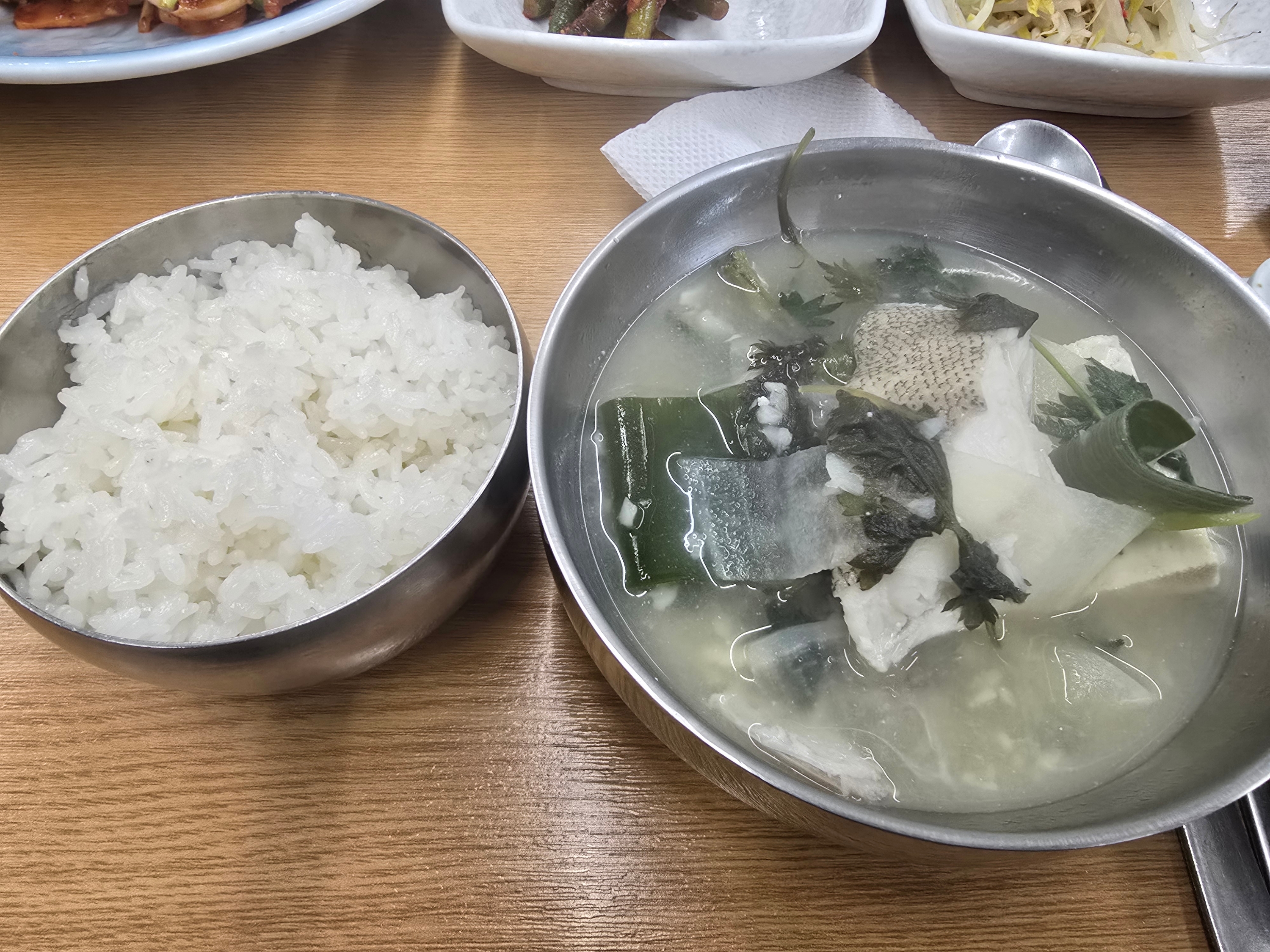 공깃밥과 함께 같이 한 컷 찍어주고 본격적인 식사를 시작했어요 쑥의 향기와 함께 어우러진 도다리의 살을 잘 발라 내서 먹는 국은 시원하고 칼칼한 게 너무 맛있었어요