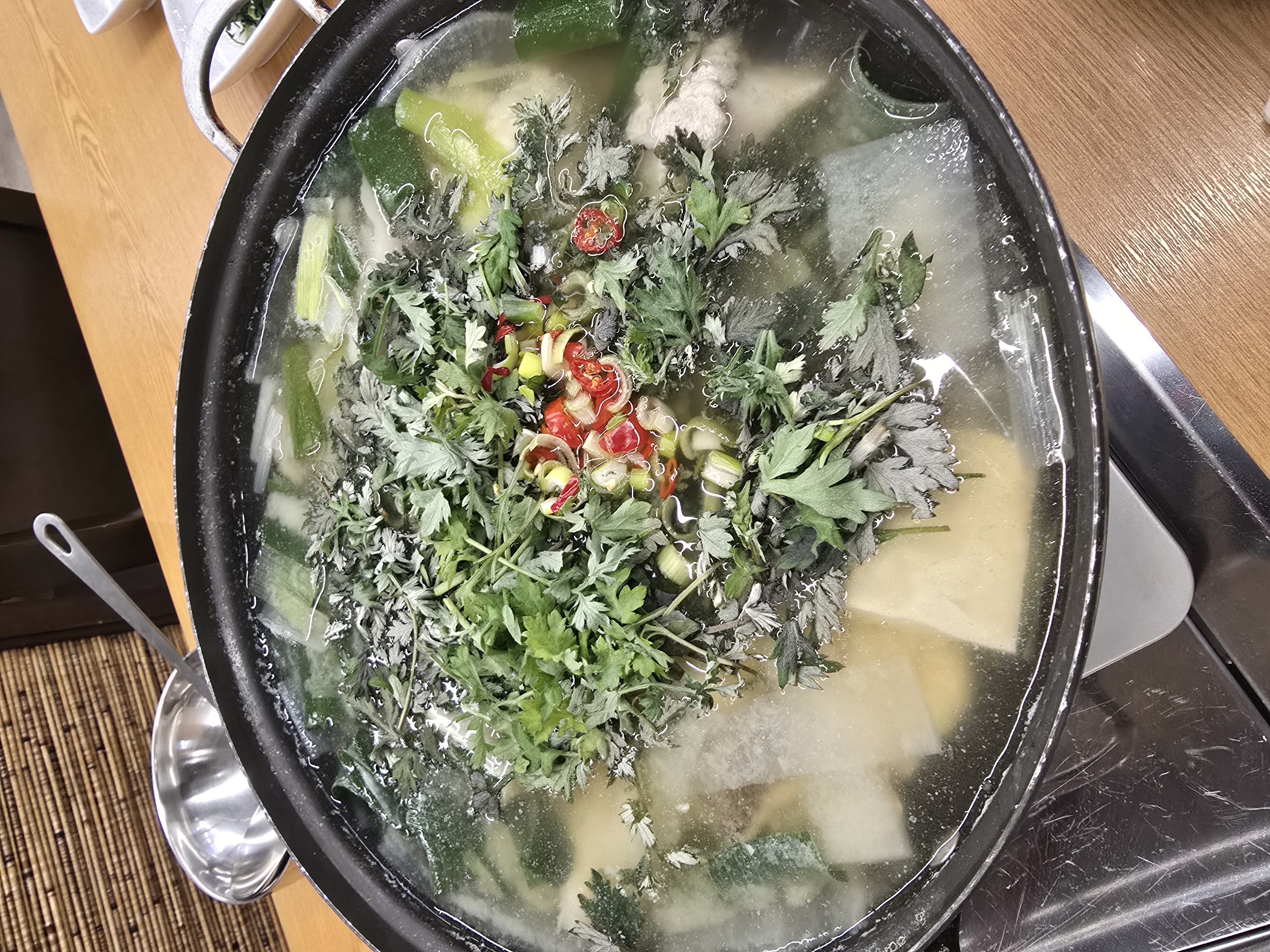 보글보글 잘 끓인 쑥국 한국자 퍼서 개인접시에 덜고 보니 먹음직스러운 자태가 음...
