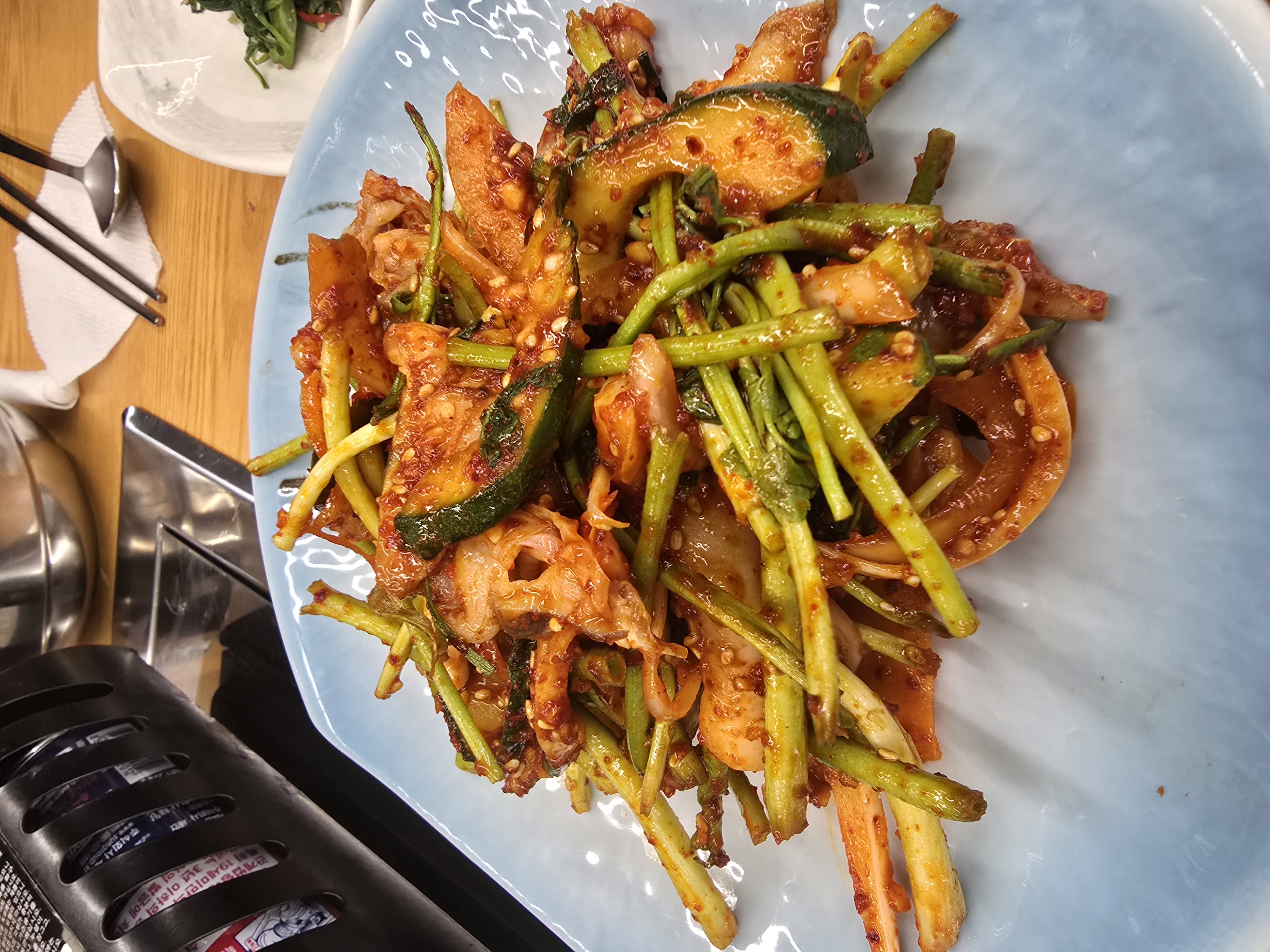 사이드메뉴로 시킨 갑오징어무침이에요 향긋한 미나리와 함께 버무려져서 나오는 오징어무침은 새콤한 양념과 함께 쫄깃한 오징어의 식감까지 더해지니 밥과 함께 또 다른 매력을 주더라고요