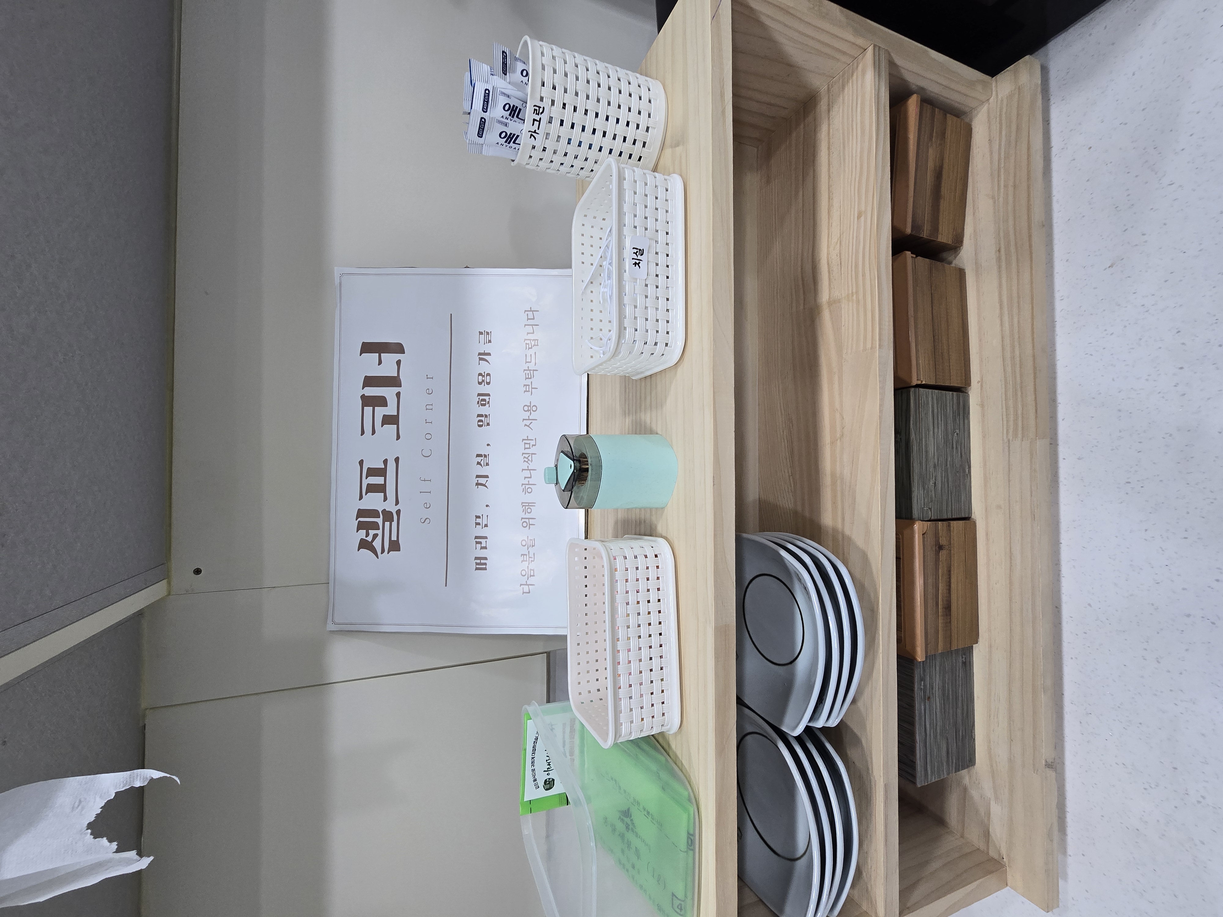 셀프코너에는 다른 곳과 좀 다르게 🤔 기본반찬 셀프가 아니라 머리끈 앞접시, 치실, 가글 등이 비치되어 있어요 😁