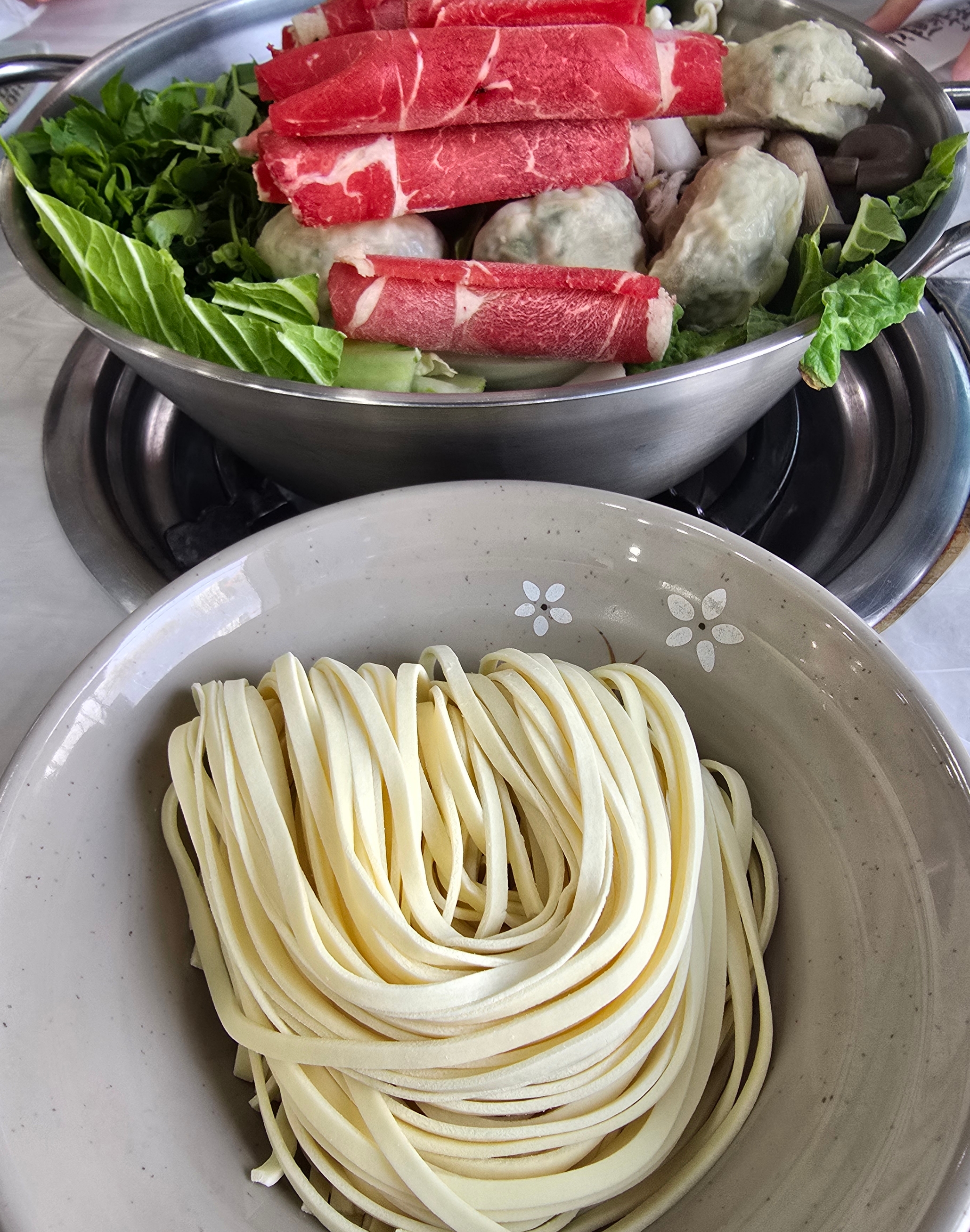 샤브샤브에 있는 야채와 고기를 맛있게 먹었으면 칼국수가 빠질 수 없죠. 자가 재미난 면을 넣어서 육수를 조금 더 붓고 칼국수를 잘 익힌 다음에 가져왔는데 탱글탱글한 면발이 정말 맛있었어요