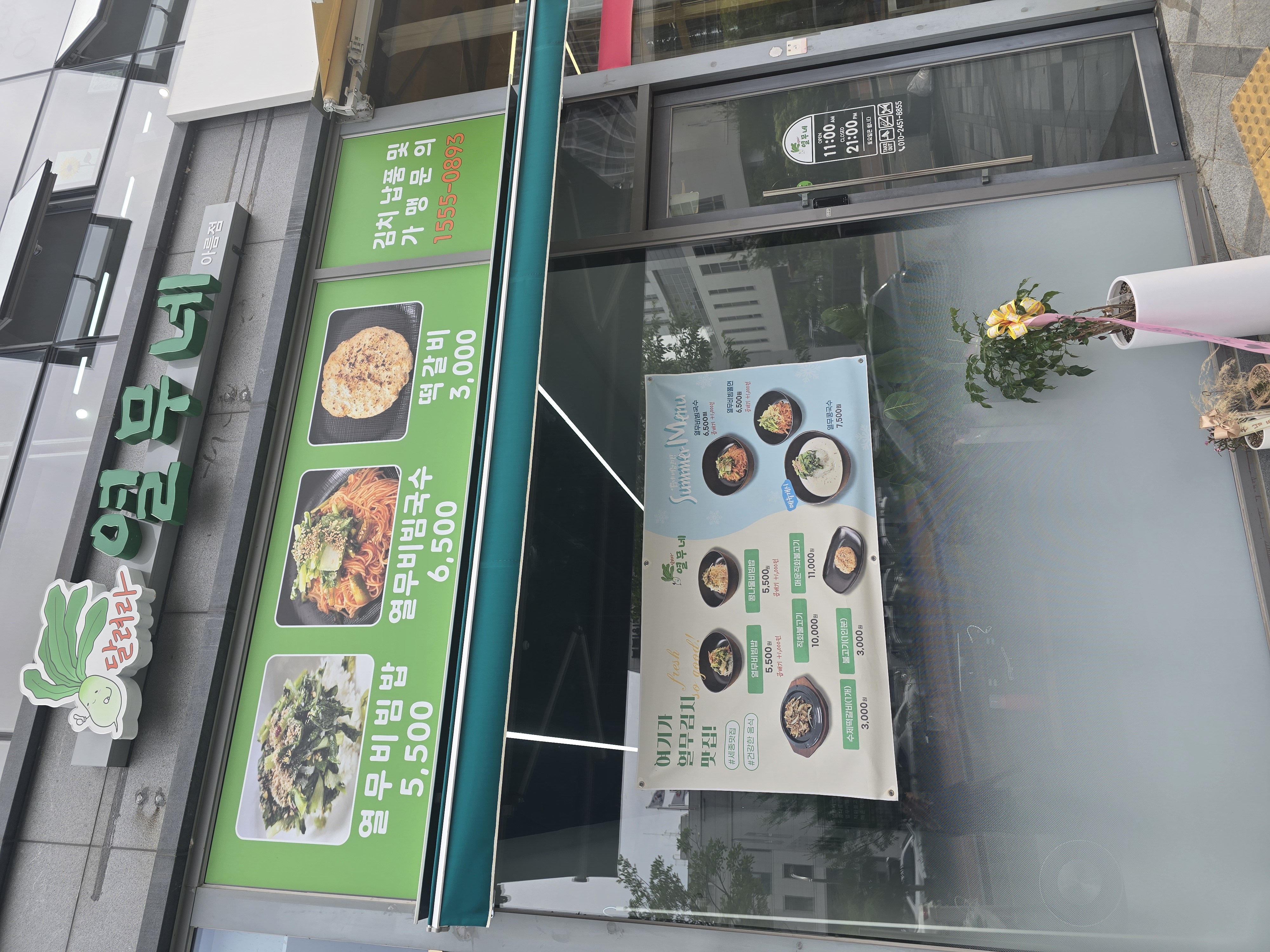 새로 오픈한 매장이라 개업축하 화분이 앞에 놓여 있었던 달려라 열무네 가게 전경이에요