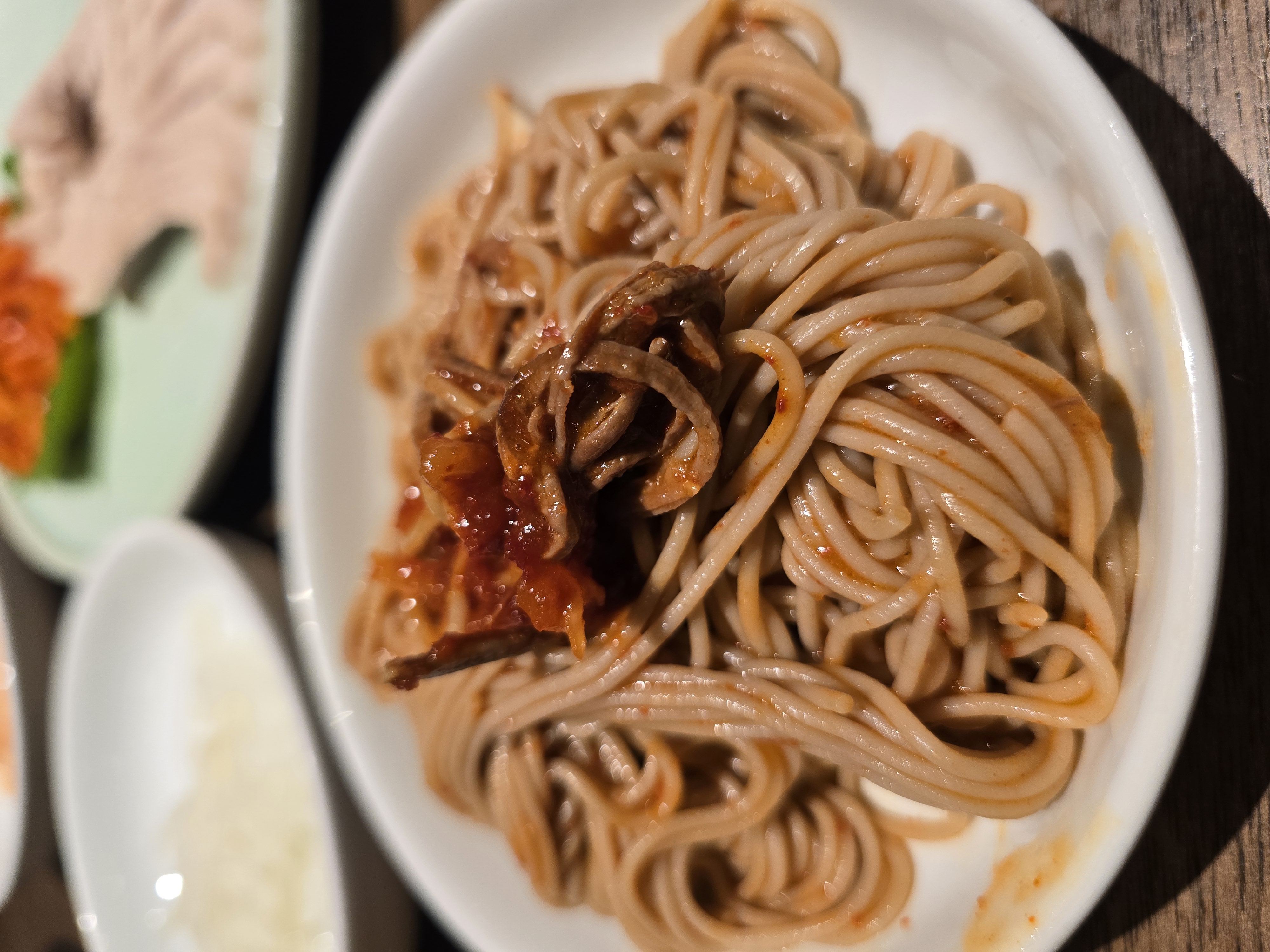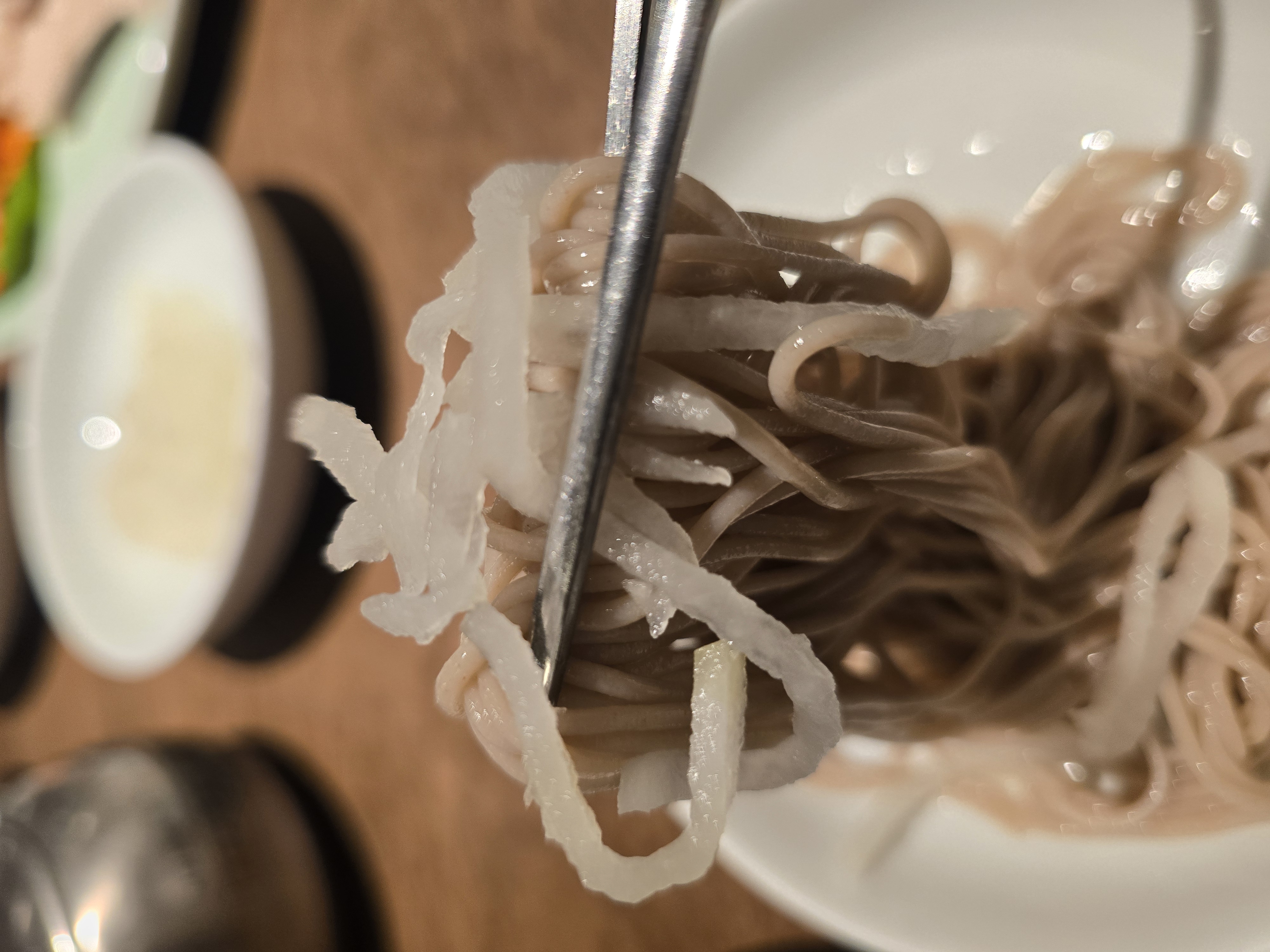 한 젓가락 크게 집어서 먹었는데 역시 은근하게 퍼지는 메밀향과 슴슴하기 그지없는 육수