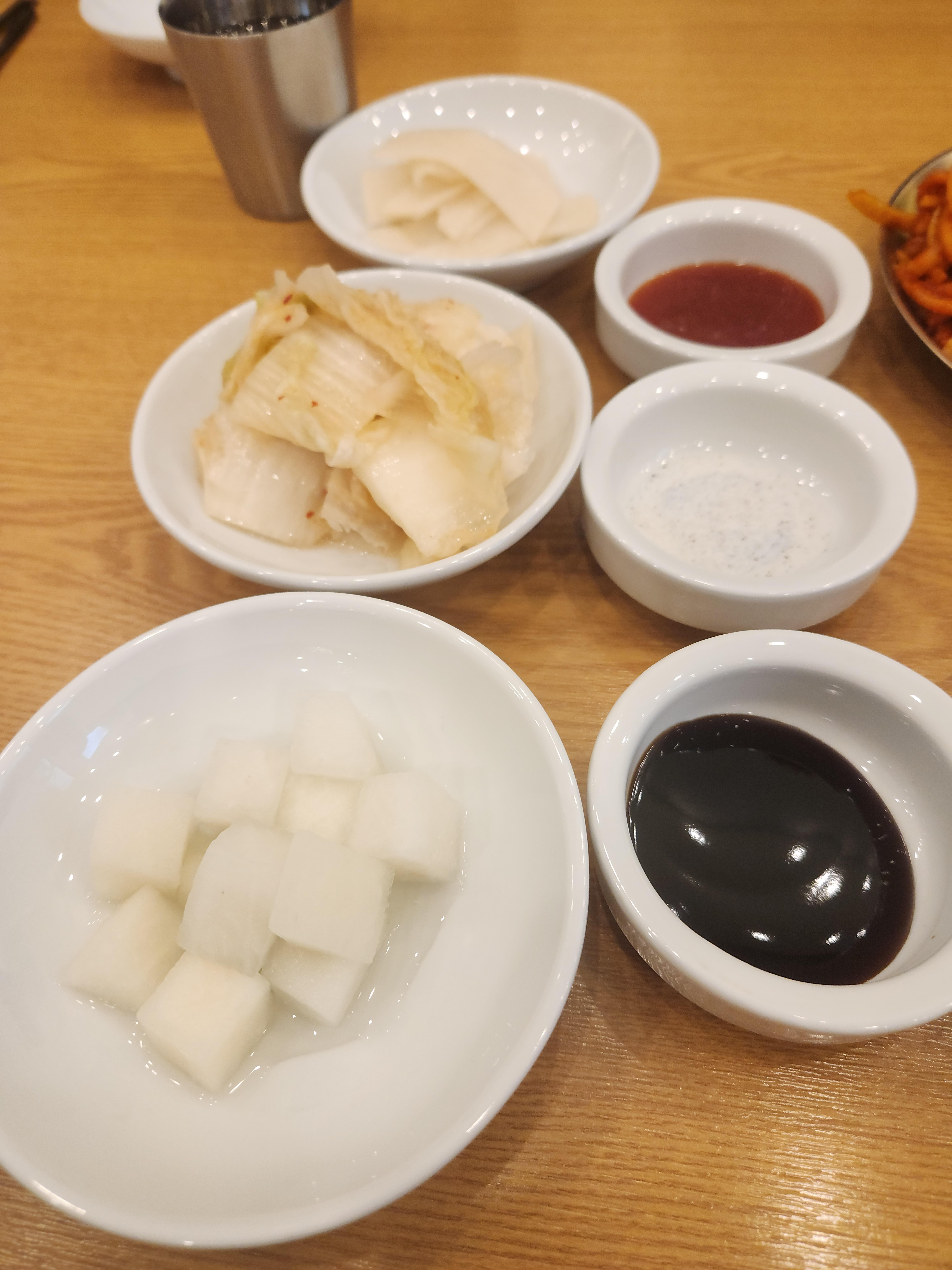 기본찬은 백김치와 무김치, 절임무, 소금이랑 닭튀김 소스 2가지가 나오는데