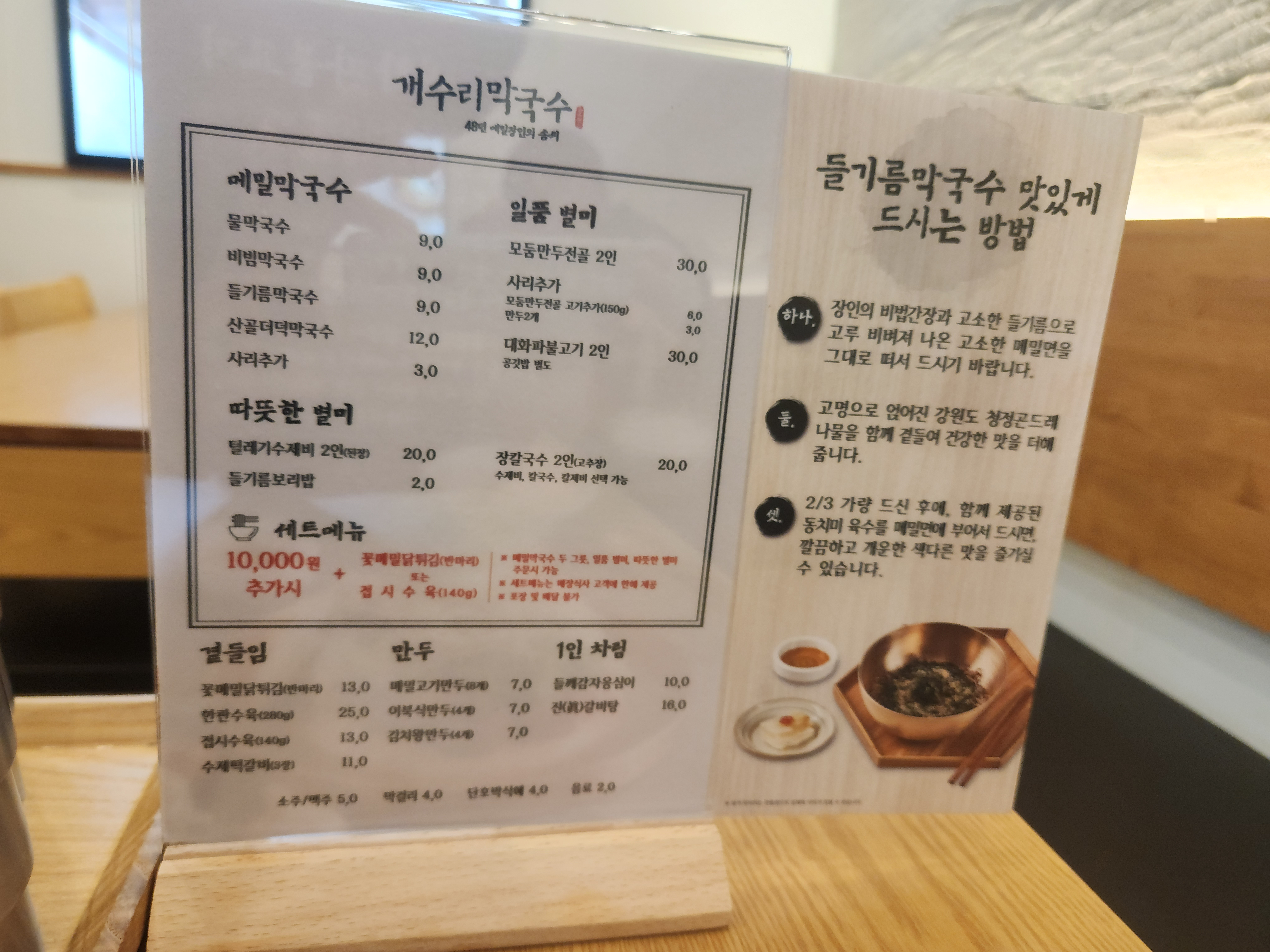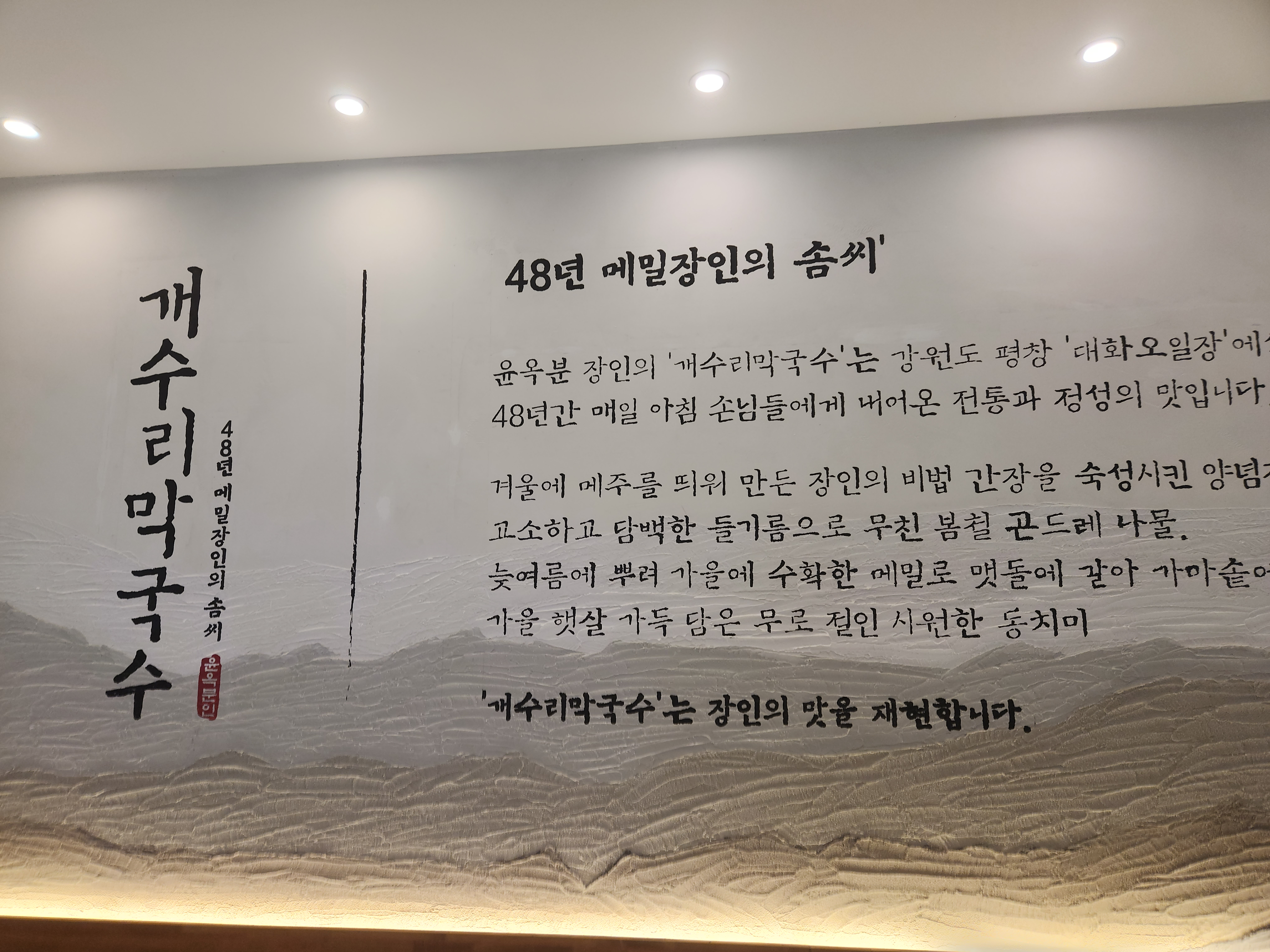 개수리 막국수의 소개글이 크게 벽면에 붙어있어요