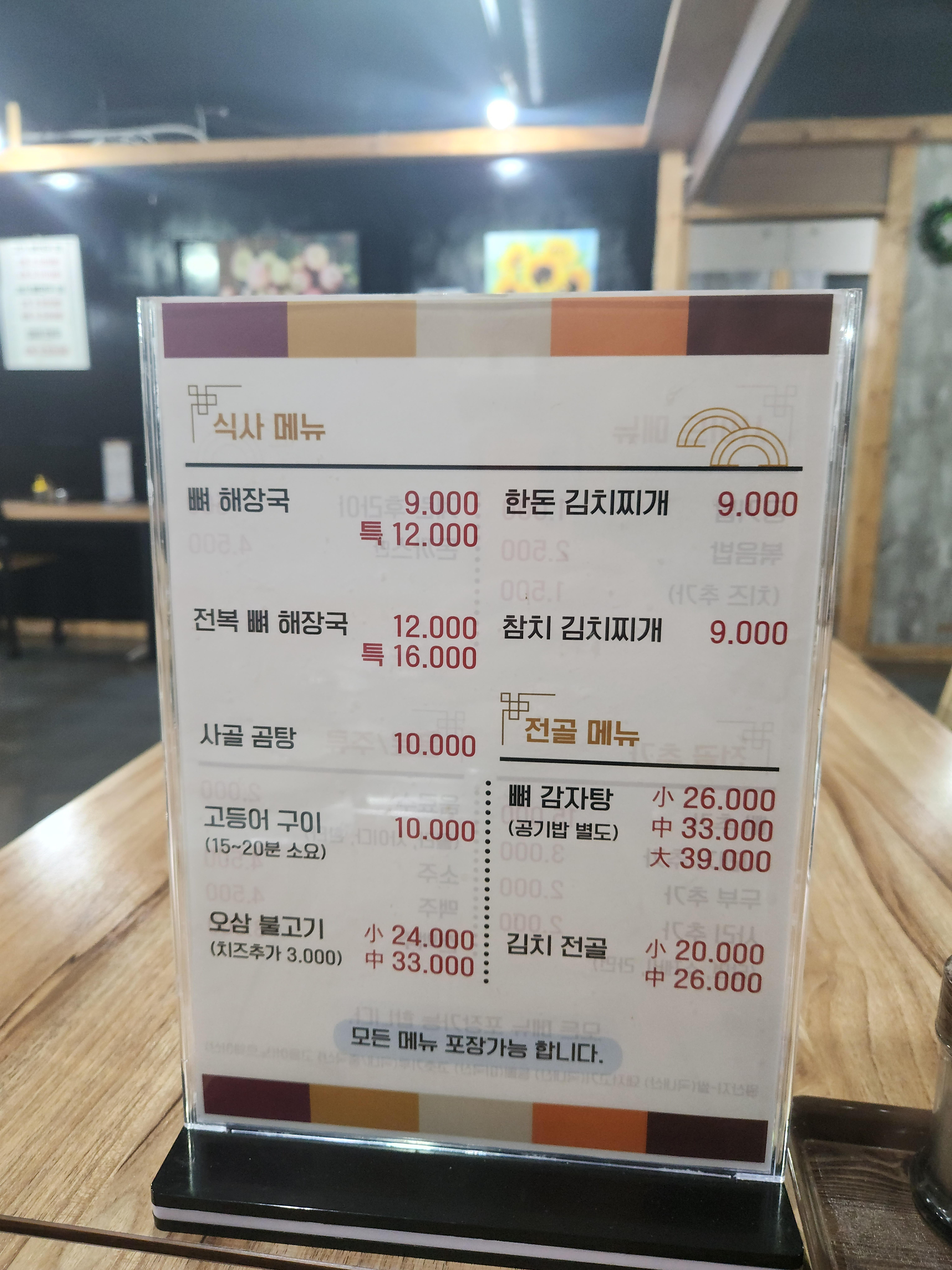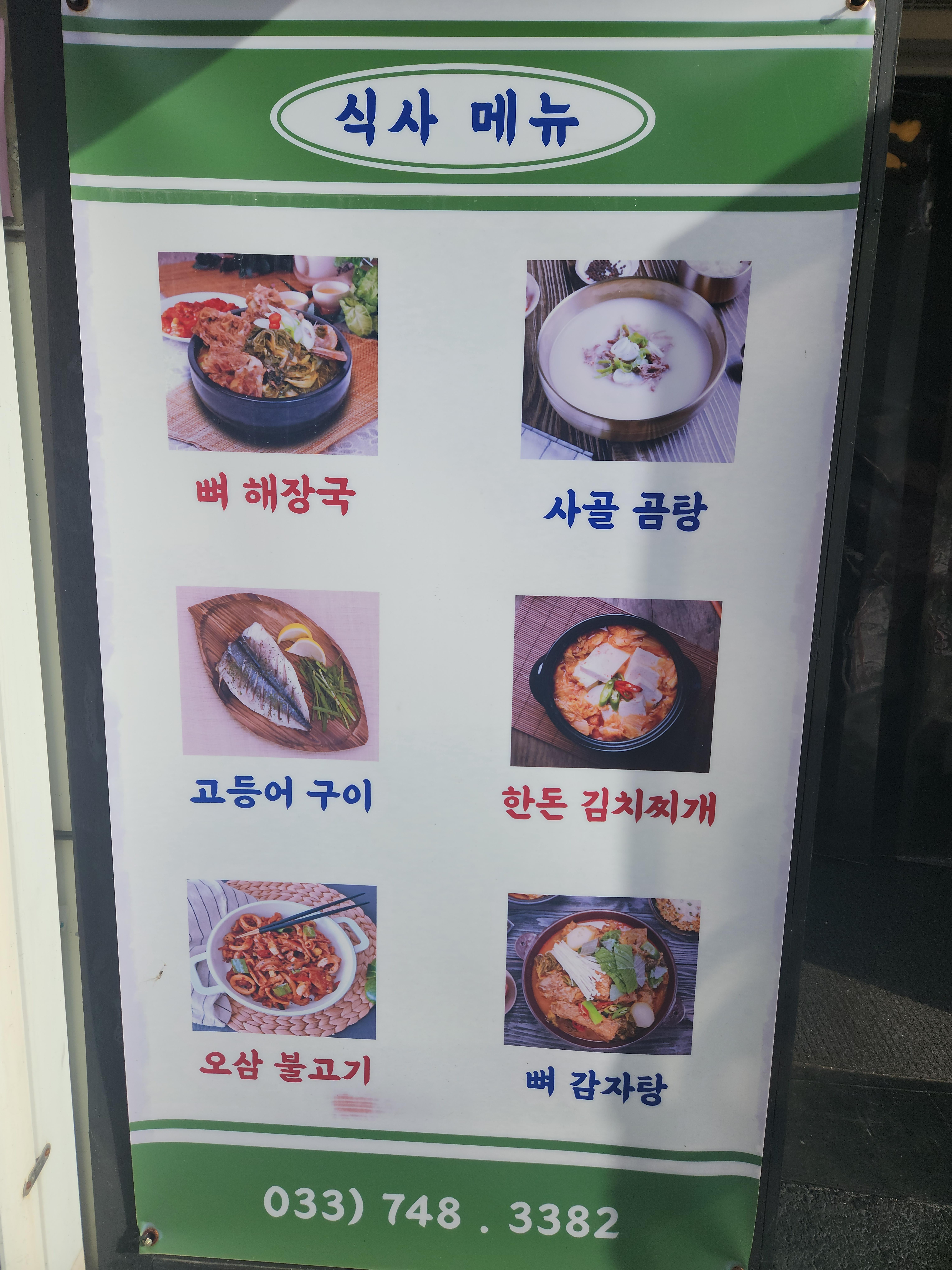 식사메뉴는 뼈해장국, 곰탕, 김치찌개 등이 있어요