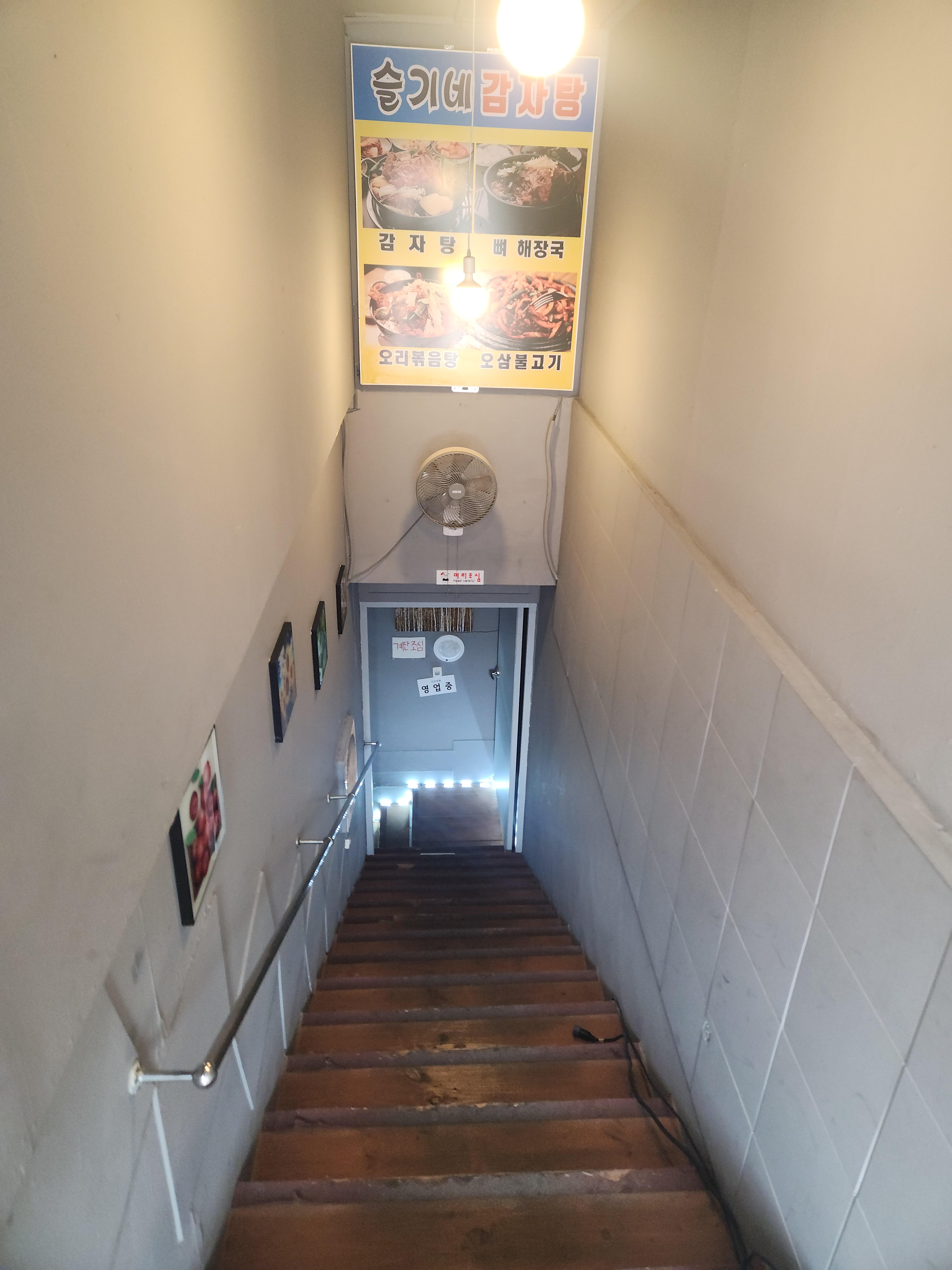 지하에 식당이 있어서 계단으로 내려가야 해요