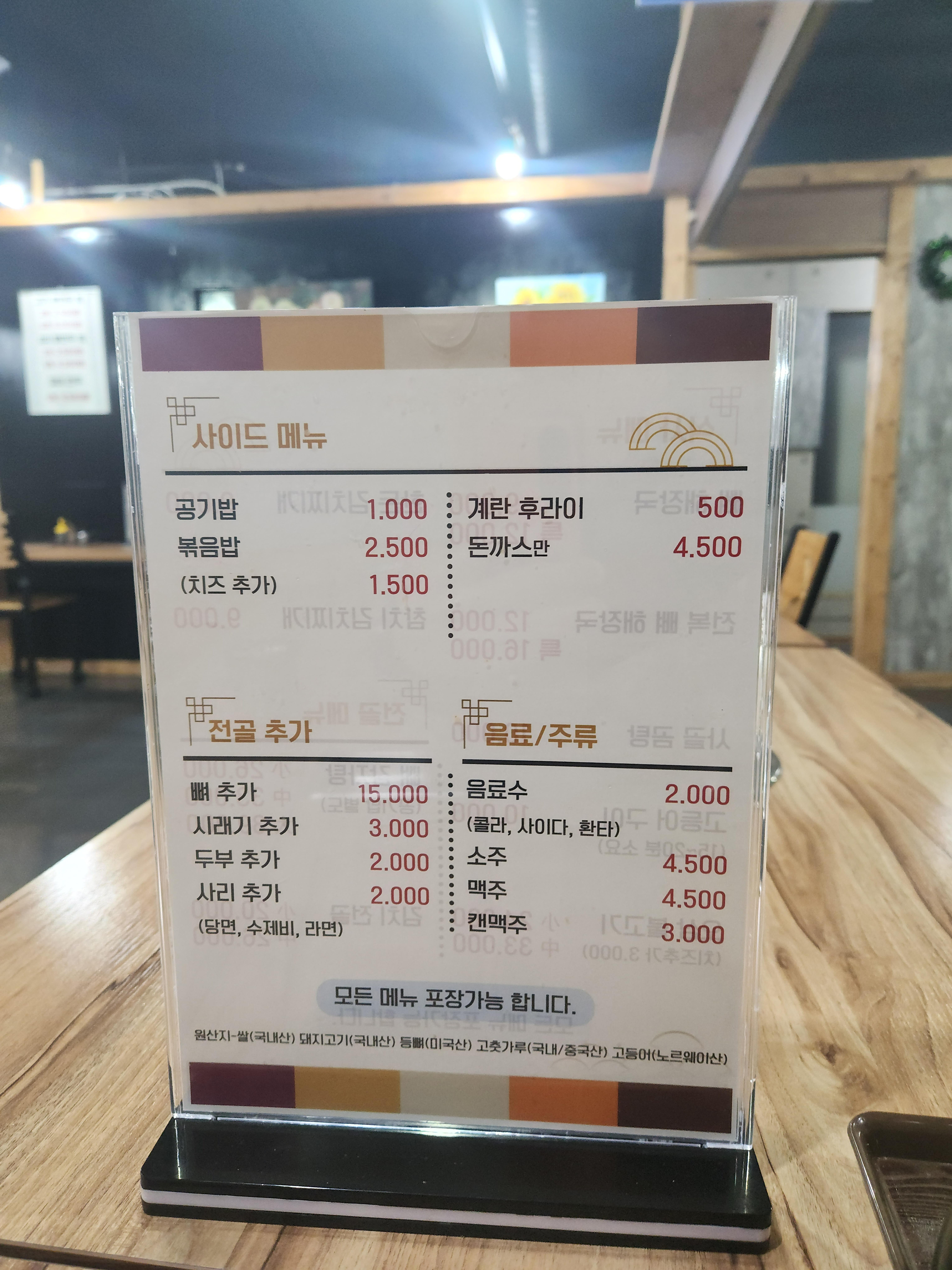 사이드메뉴는 뒤에 있는데 전골에 뼈나 시래기 추가도 되고